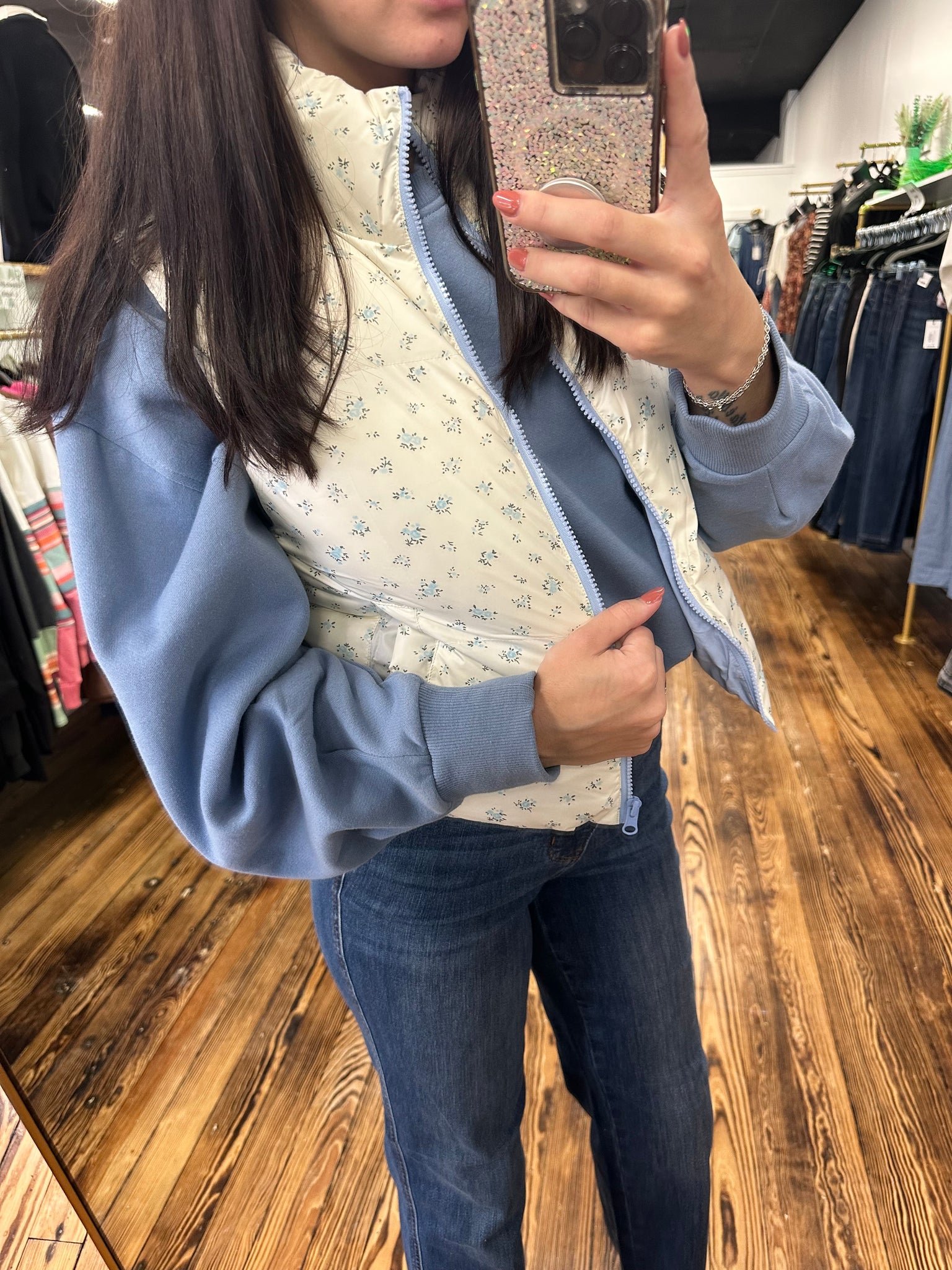 This Blue Floral Puffer Vest combines lightweight warmth with a charming floral design, perfect for layering in cool weather. Its quilted construction offers insulation without bulk, while the vibrant pattern adds a stylish touch to any outfit. Ideal for both casual and outdoor wear, this vest provides comfort and versatility with expert craftsmanship.